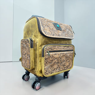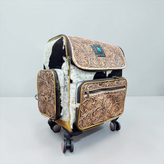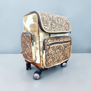 Floral tooled leather & cowhide rolling backpack