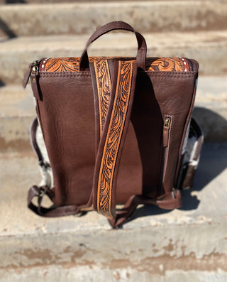 Brown tooled leather & cowhide backpack