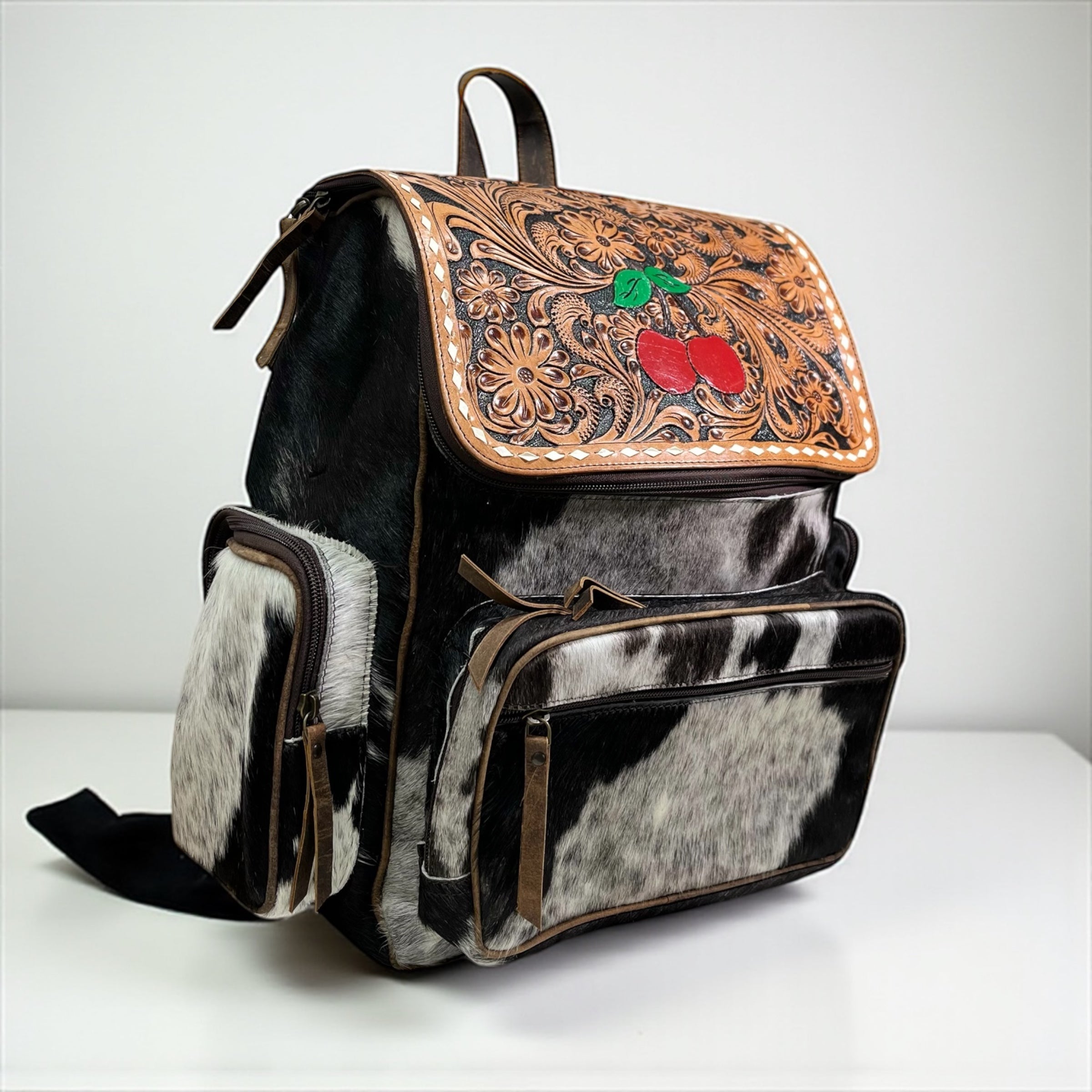 Cherry tooled leather & cowhide backpack