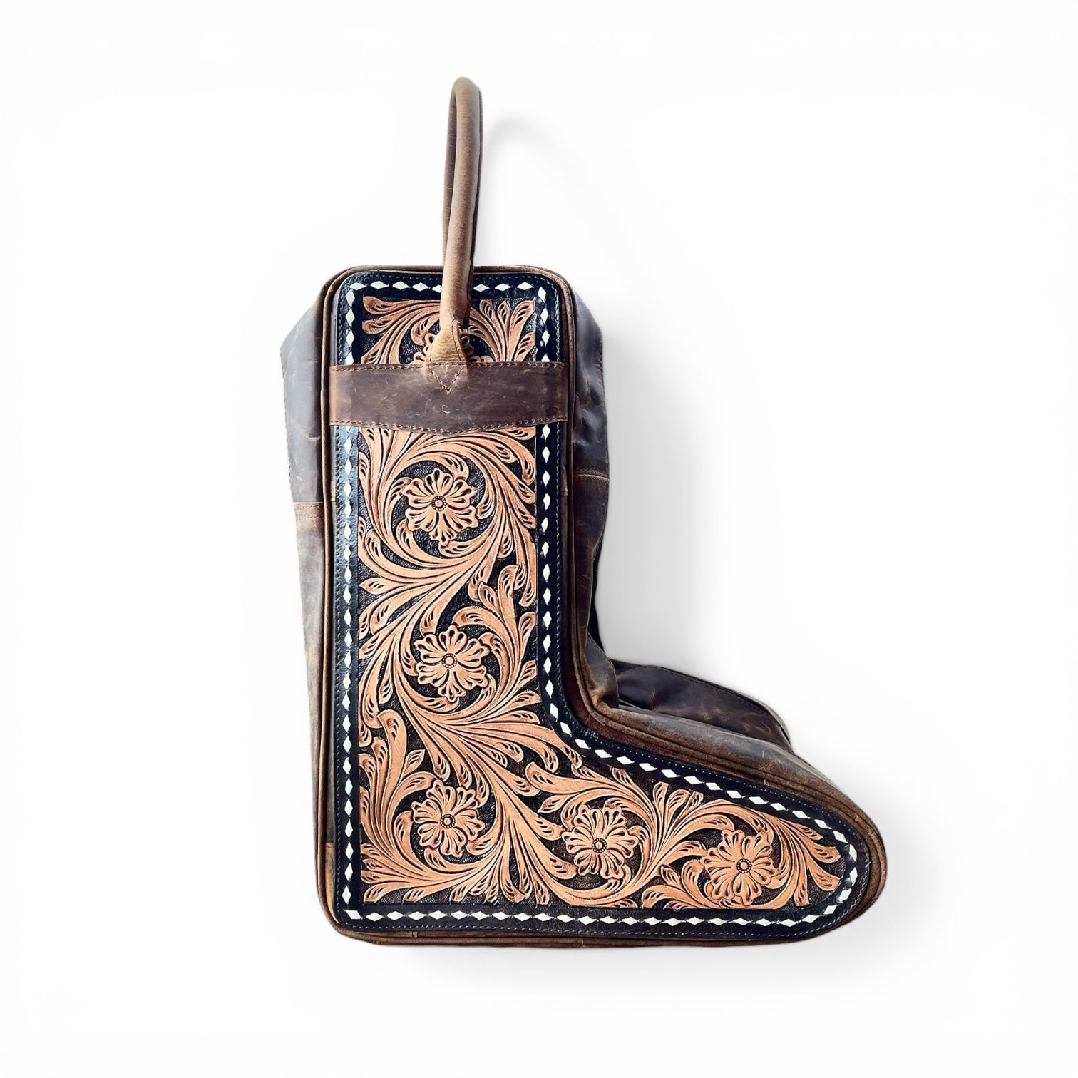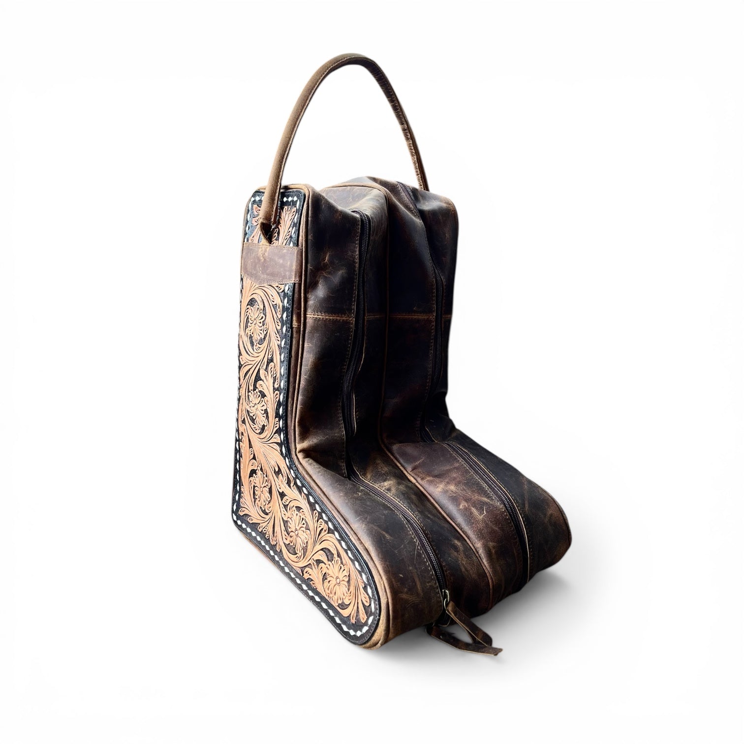 premium tooled leather travel bag. Handcrafted from high-quality leather, each bag features intricate tooling patterns that make every piece unique. The spacious interior (1.6’ x 1.21’) is designed to hold a pair of boots securely, while the sturdy handles and reinforced stitching ensure durability for every journey. Perfect for weekend getaways, rodeos, or long trips, this bag combines rugged western charm with practical functionality.