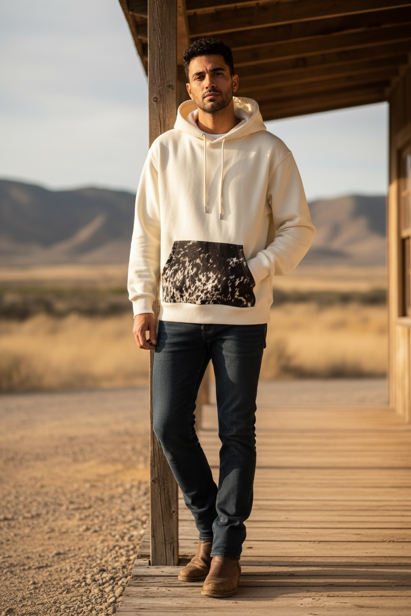 Cozy meets western style! This soft hoodie features a genuine cowhide pocket, giving each piece a one-of-a-kind look. Perfect for everyday wear with a rustic touch.