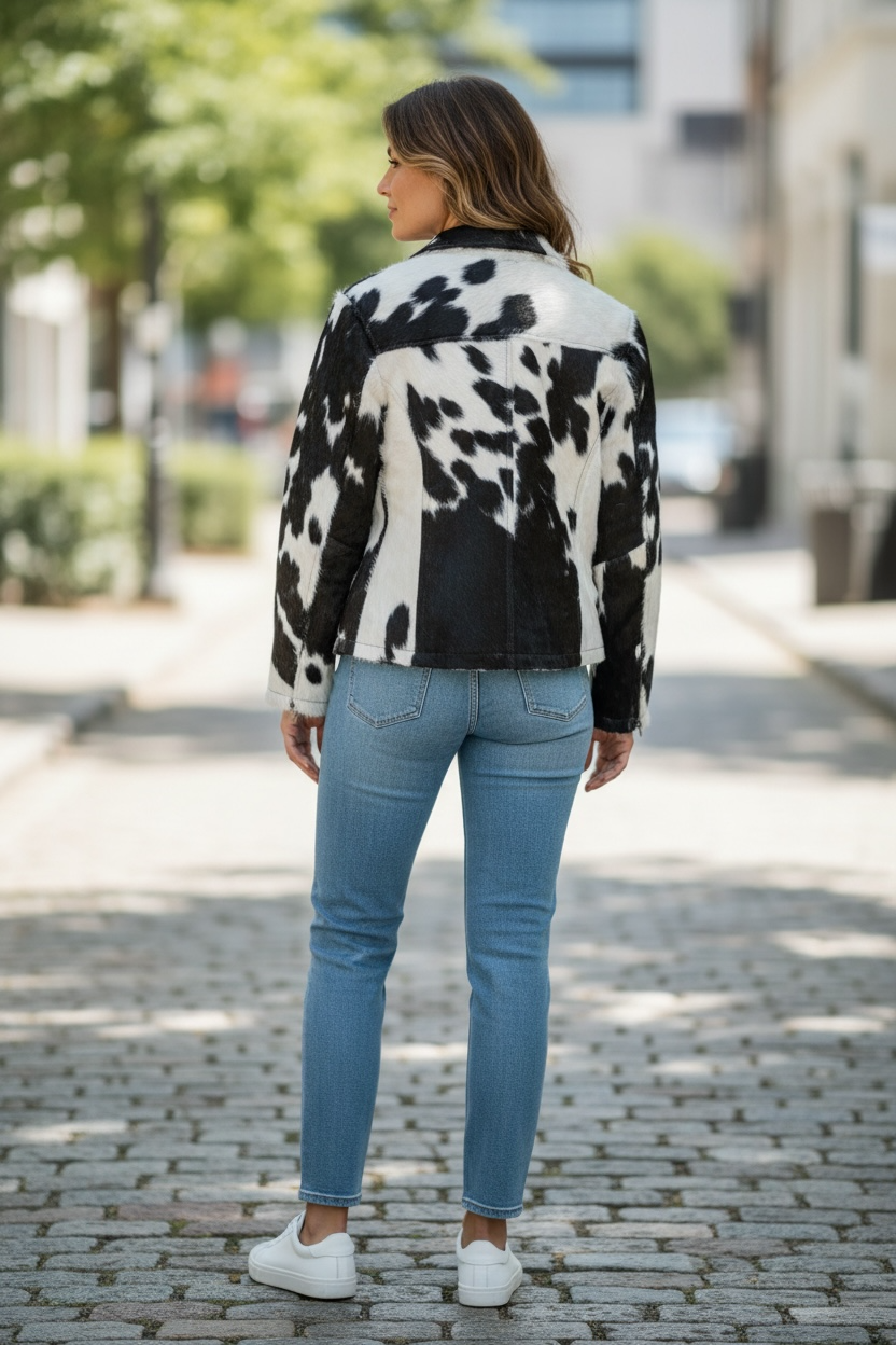 Crafted from genuine cowhide, this jacket features natural hair-on hide with unique patterns—no two are exactly alike. Designed for both style and durability, it offers a comfortable fit while making a bold western statement. Perfect for layering, everyday wear, or adding a rugged touch to any outfit. A timeless piece that combines authentic craftsmanship with standout character.