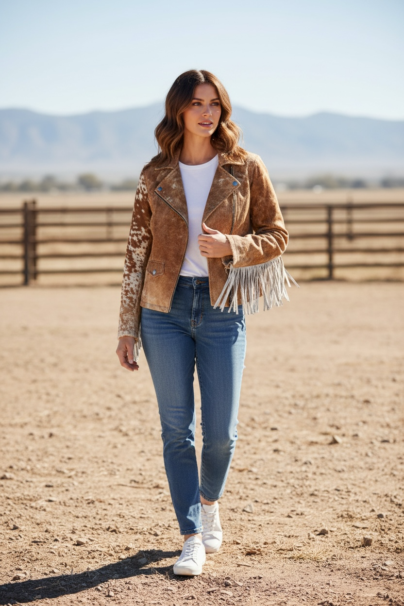 Crafted from genuine cowhide, this jacket features natural hair-on hide with unique patterns—no two are exactly alike. Designed for both style and durability, it offers a comfortable fit while making a bold western statement. Perfect for layering, everyday wear, or adding a rugged touch to any outfit. A timeless piece that combines authentic craftsmanship with standout character.