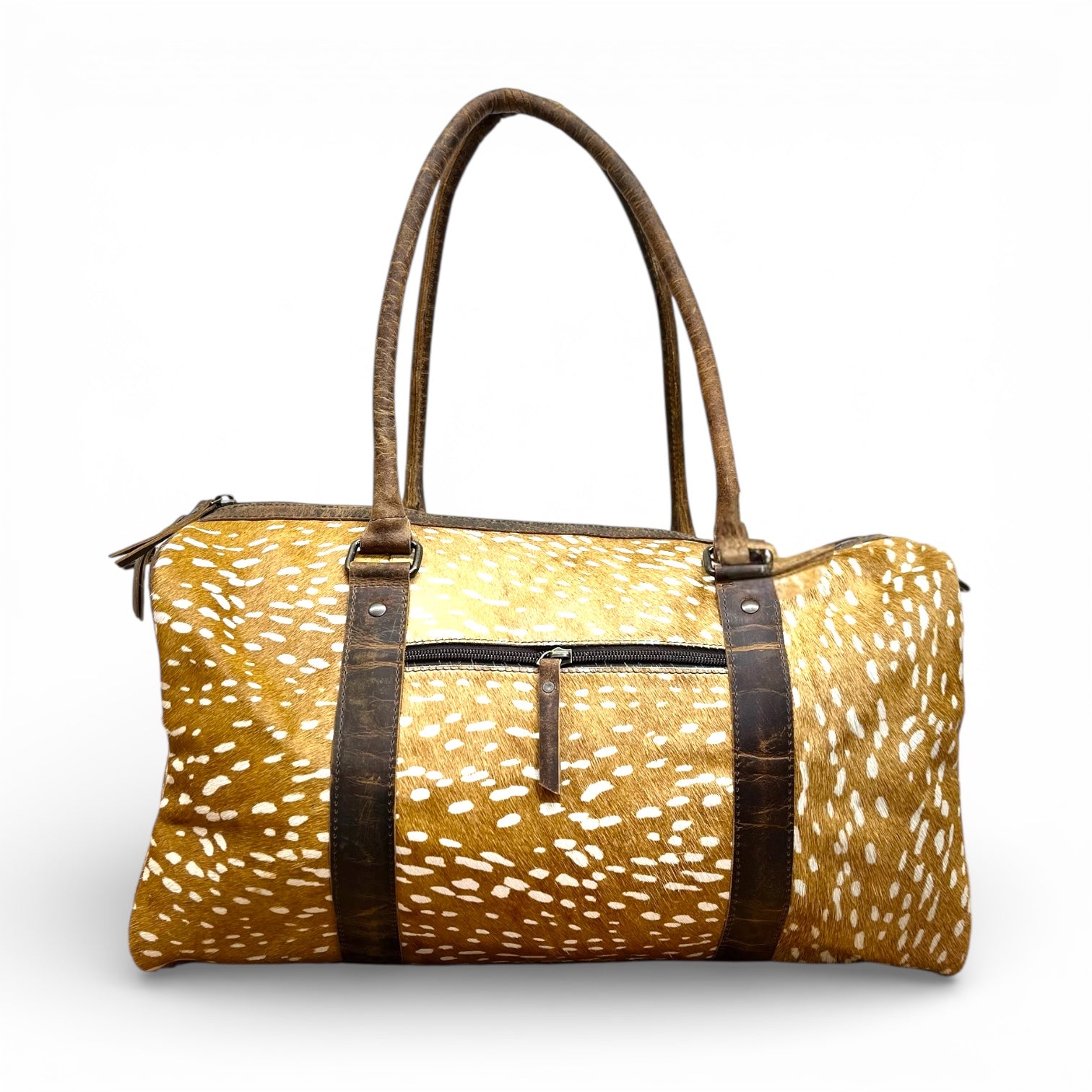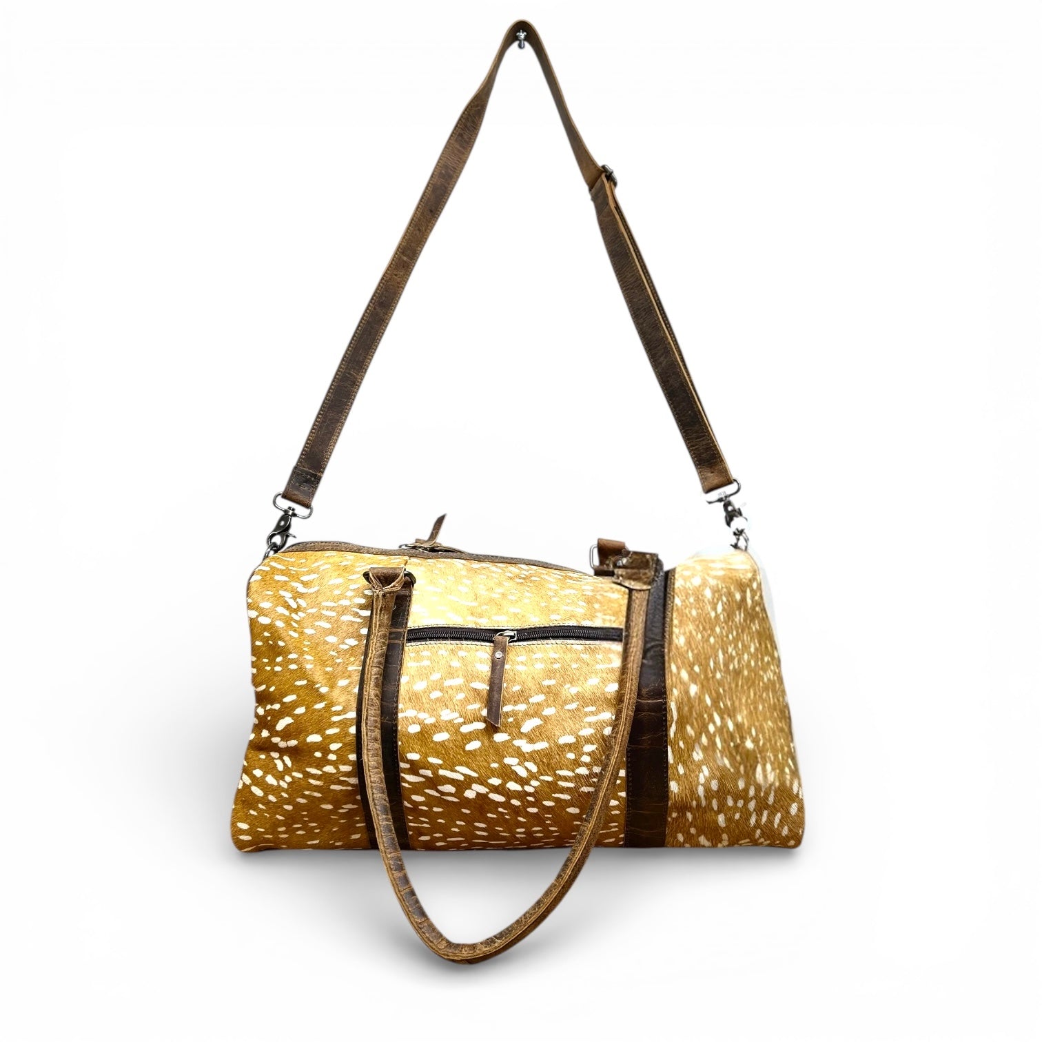 Travel in true Western style with this stunning cowhide duffle bag featuring a unique deer print design. Crafted to combine durability and eye-catching detail, this bag offers a spacious interior perfect for weekend getaways, travel days, or everyday use. Designed with both top handles and an adjustable crossbody strap for versatile and comfortable carrying.