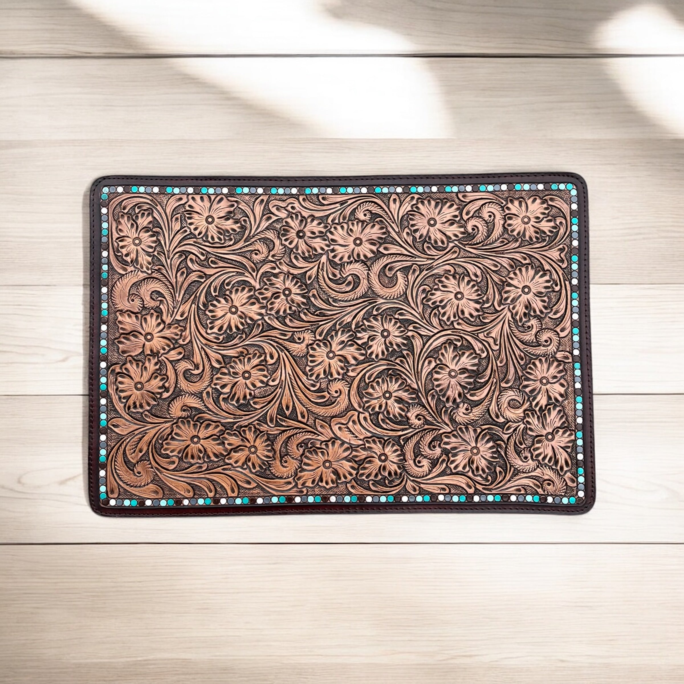 Elevate your dining experience with our exquisite Tooled Leather Placemat, designed to add a touch of sophistication to your dinner table. Crafted from high-quality leather, each placemat features intricate tooling that showcases exceptional artistry and durability. Its natural texture not only protects your table from spills and scratches but also enhances the overall aesthetic of your dining space. Easy to clean and maintain, this placemat is perfect for both everyday use and special occasions, making it an essential addition to your home decor.
