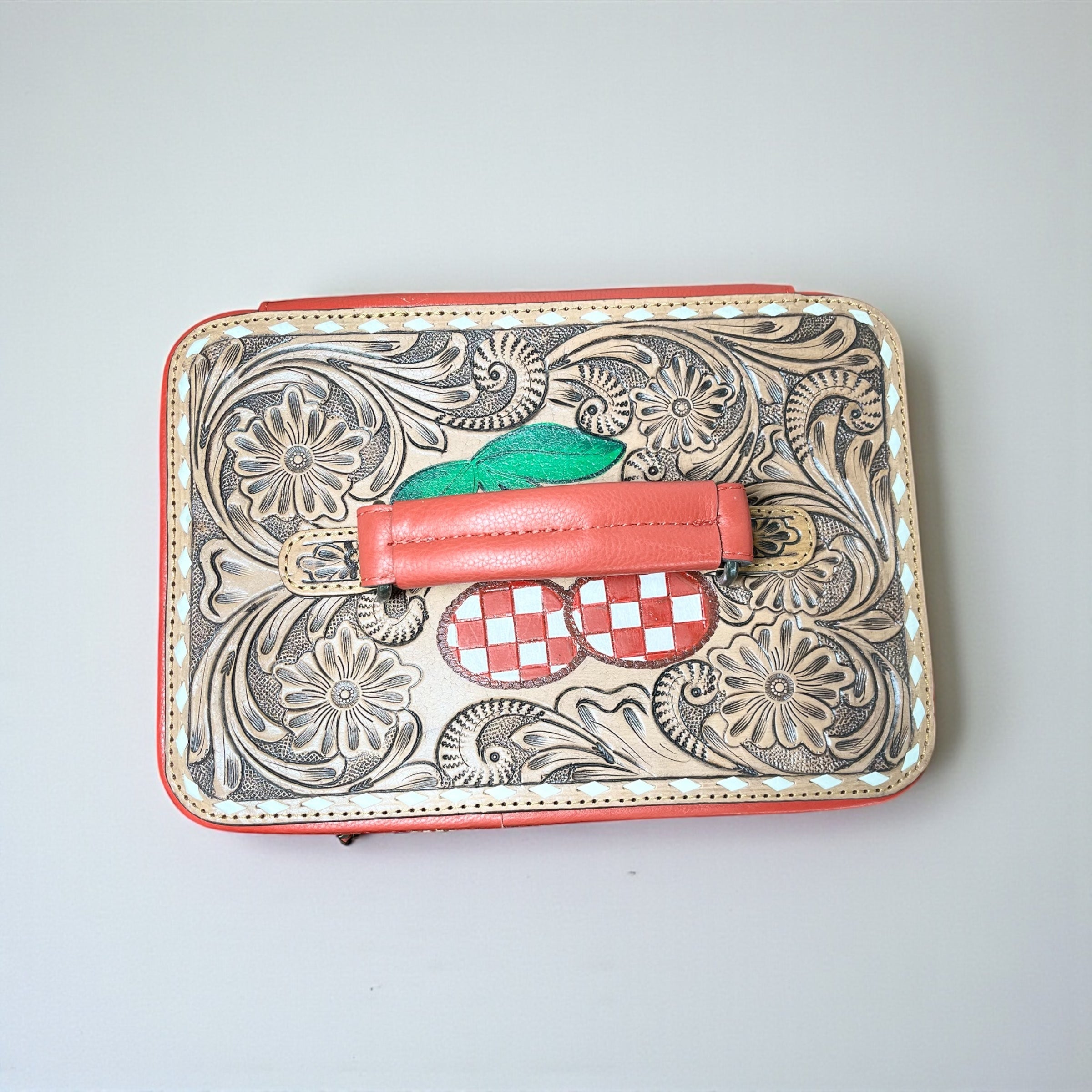 Handcrafted jewelry box made with genuine tooled leather and natural cowhide