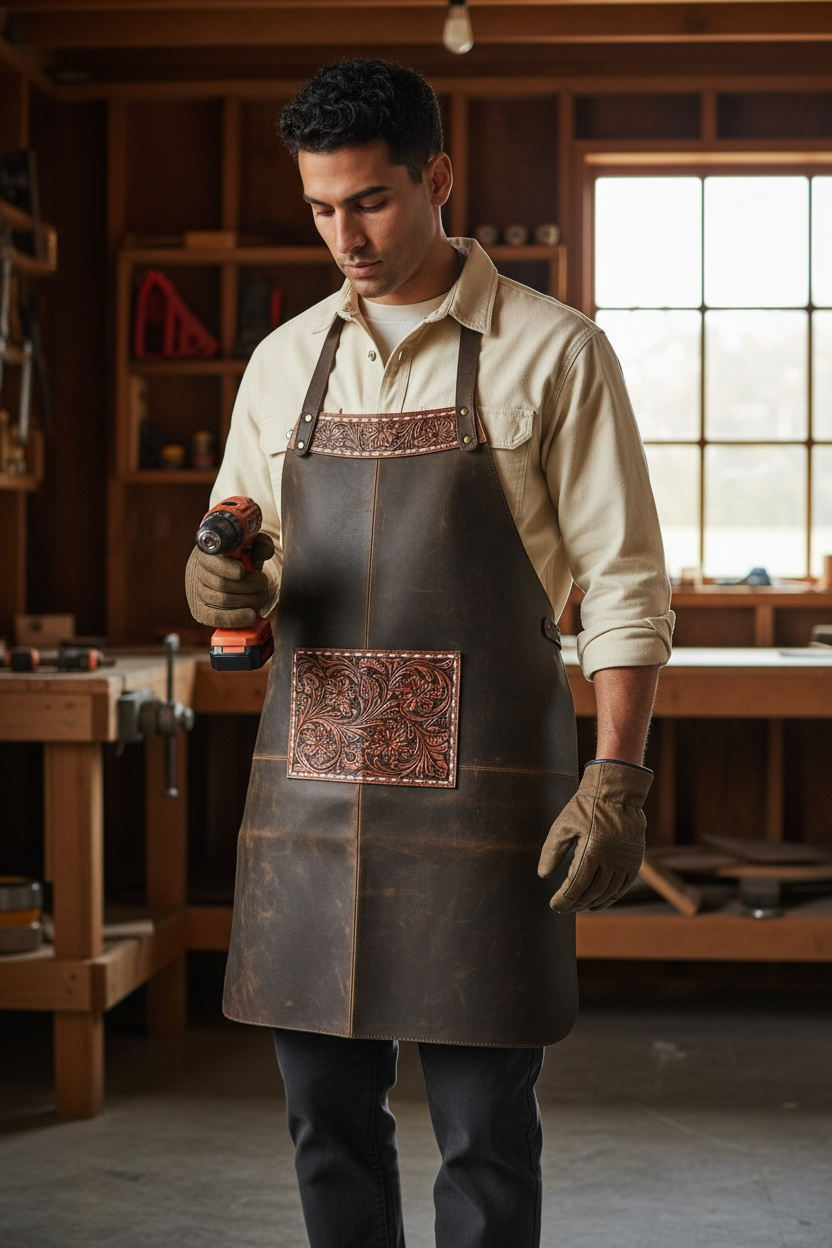 Our leather & tooled leather apron combines durability with classic western craftsmanship. Made with high-quality leather and detailed tooled leather accents, this apron is built to last while adding a bold western style to your workspace.