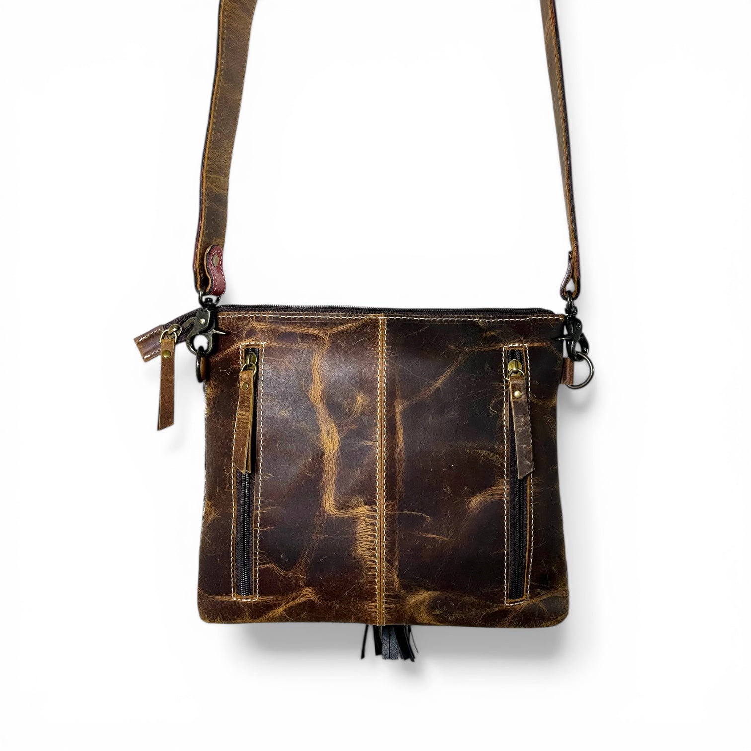 Add a bold western touch to your style with this beautiful fringe crossbody bag. Crafted with genuine tooled leather and natural cowhide, each bag features unique patterns since no two cowhides are exactly the same. The detailed tooling and flowing fringe give it a classic western look that stands out anywhere you go.