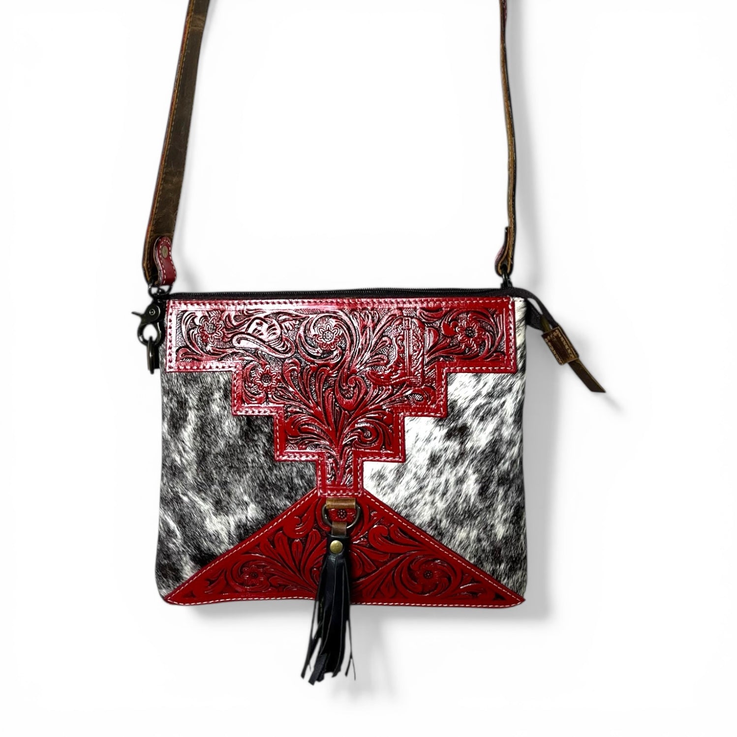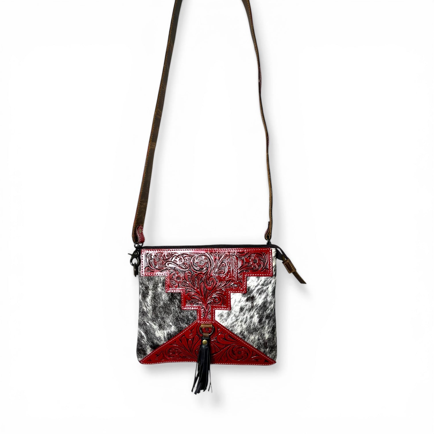 Red tooled leather & cowhide crossbody bag
