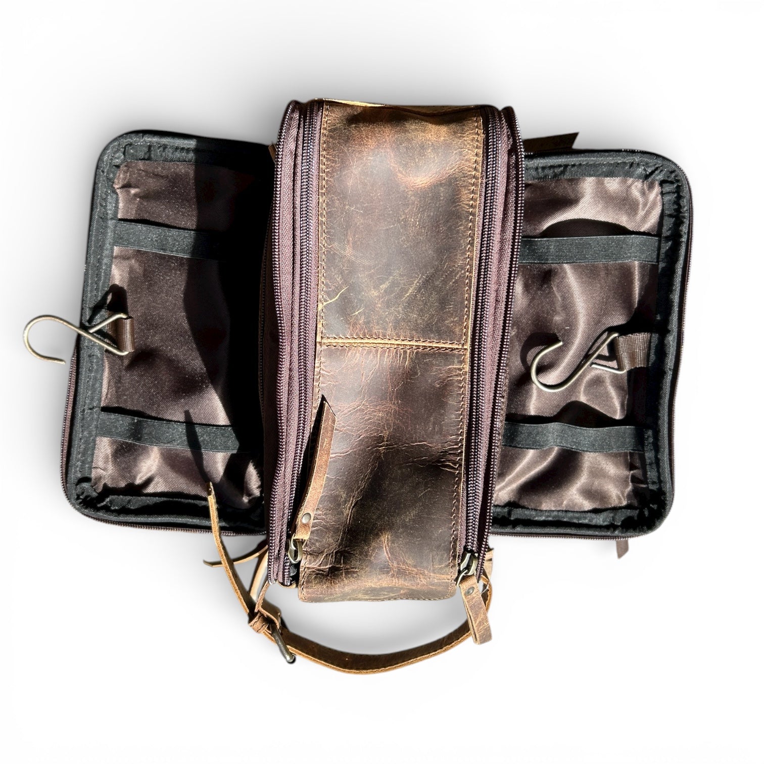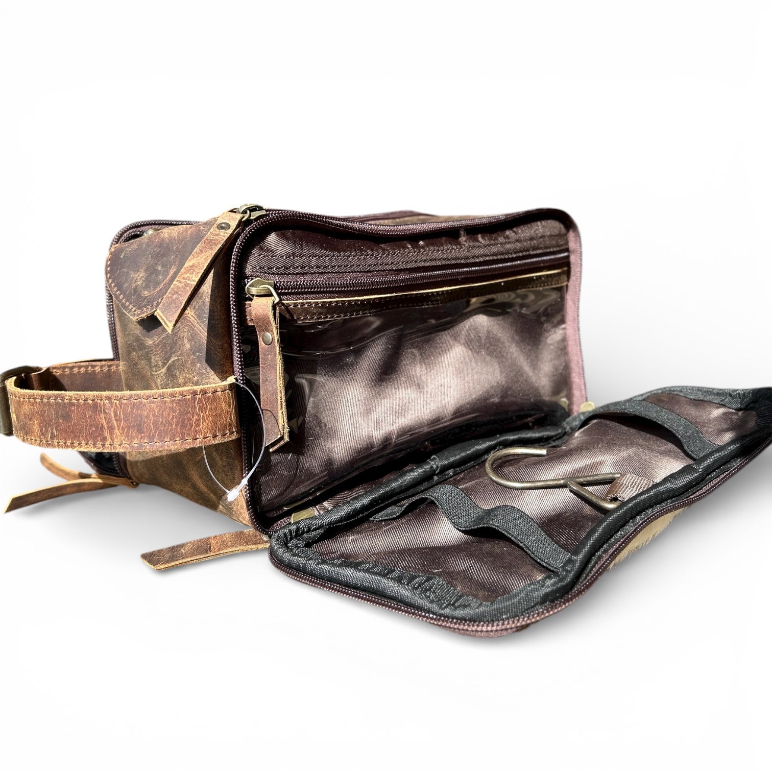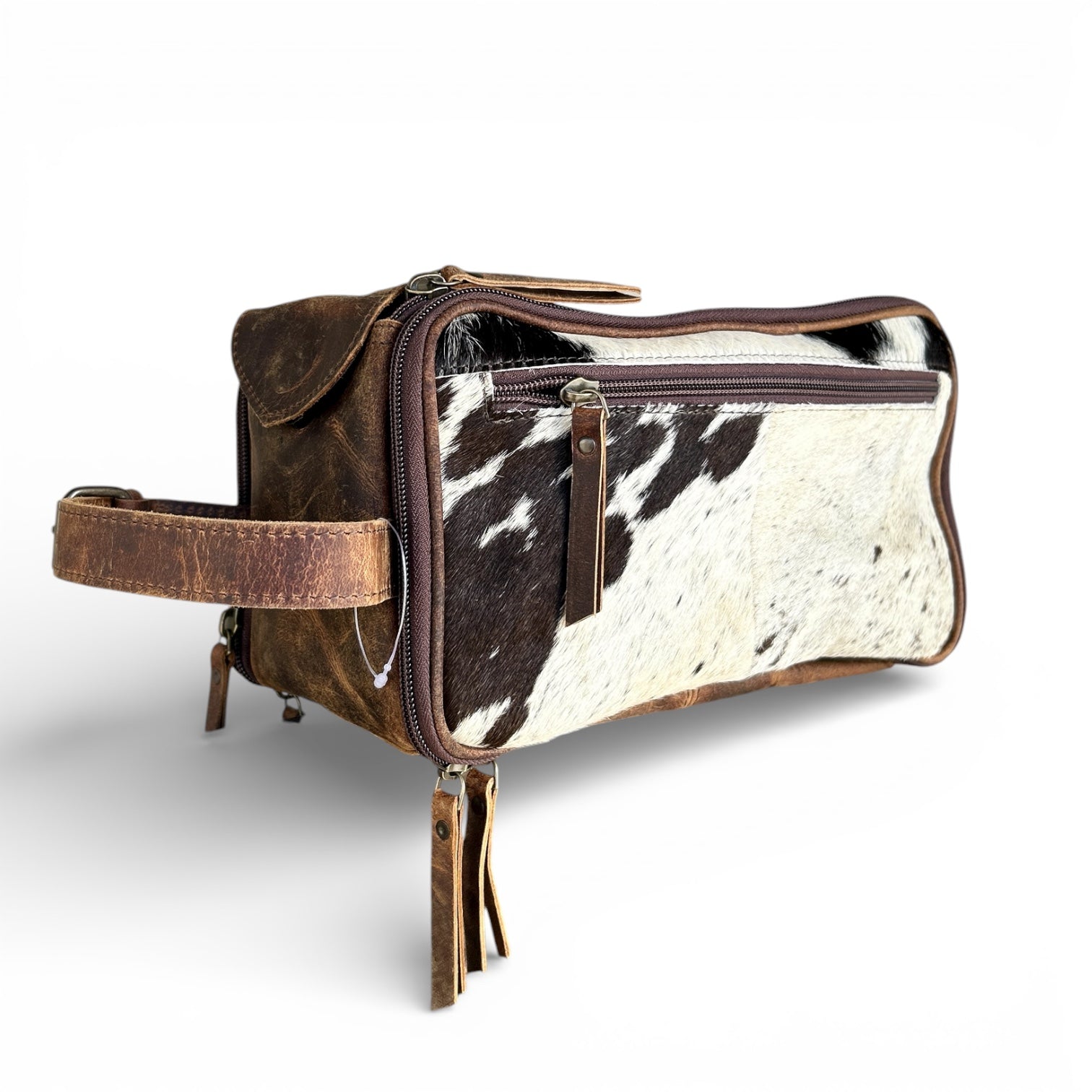 Travel in western style with this handcrafted cowhide and leather toiletry bag, designed for both durability and timeless elegance. Featuring genuine cowhide with unique natural patterns and premium leather accents, each piece is one of a kind. Its spacious interior is perfect for organizing toiletries, grooming essentials, or everyday accessories, making it ideal for travel or daily use.