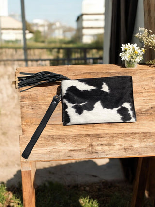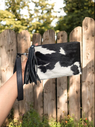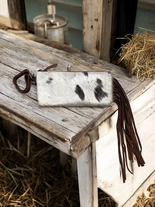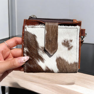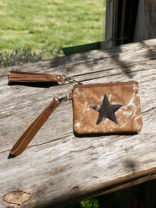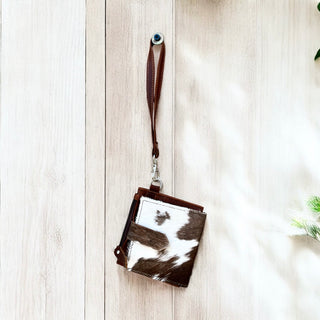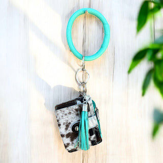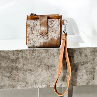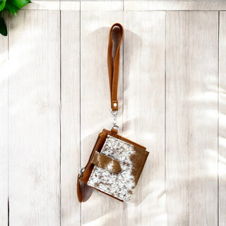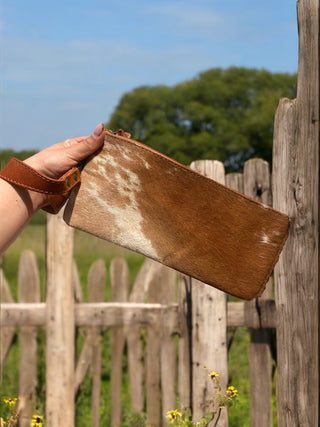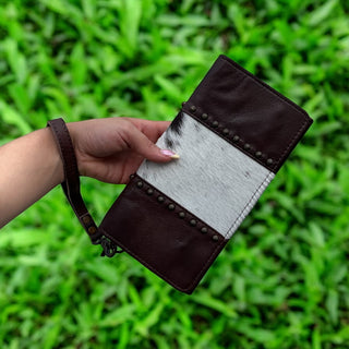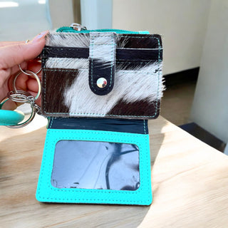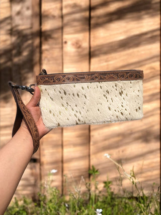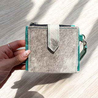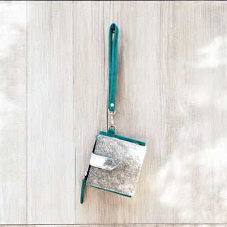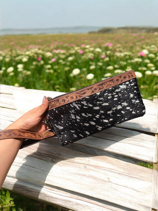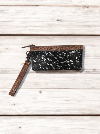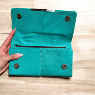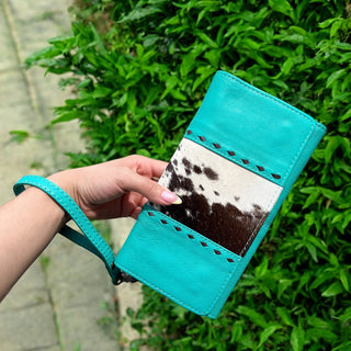 Turquoise thunderbird tooled leather & cowhide wristlet