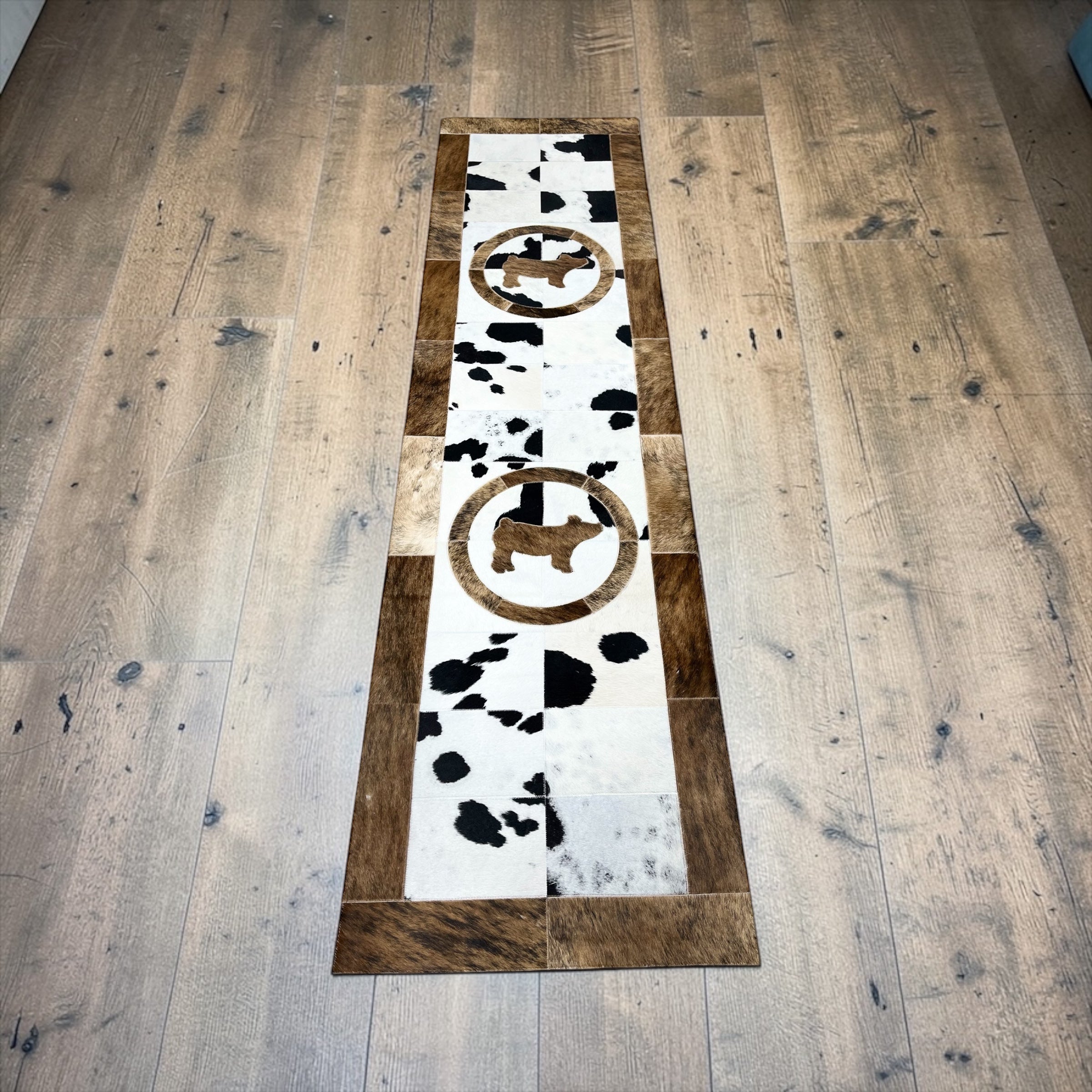 This 7x2’ cowhide patchwork runner brings rustic charm and modern style to any space.