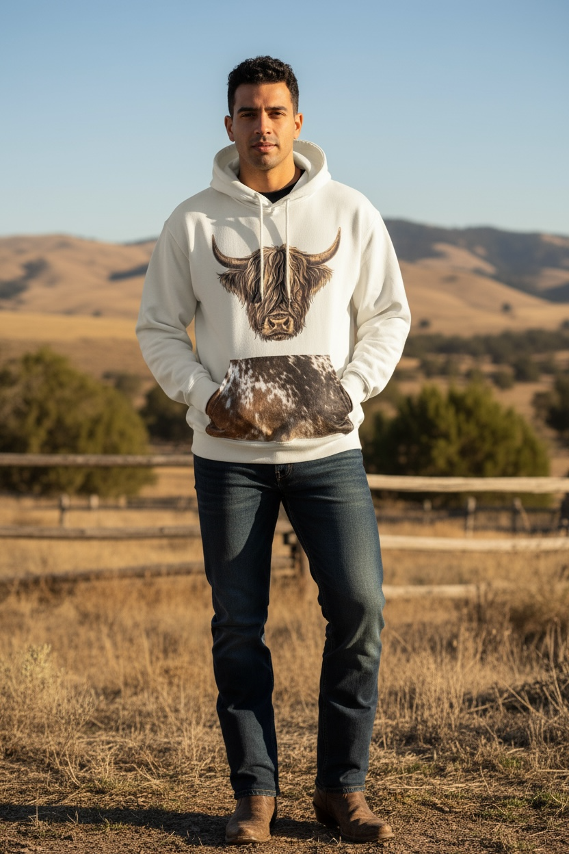 Cozy meets western style! This soft hoodie features a genuine cowhide pocket, giving each piece a one-of-a-kind look. Perfect for everyday wear with a rustic touch.