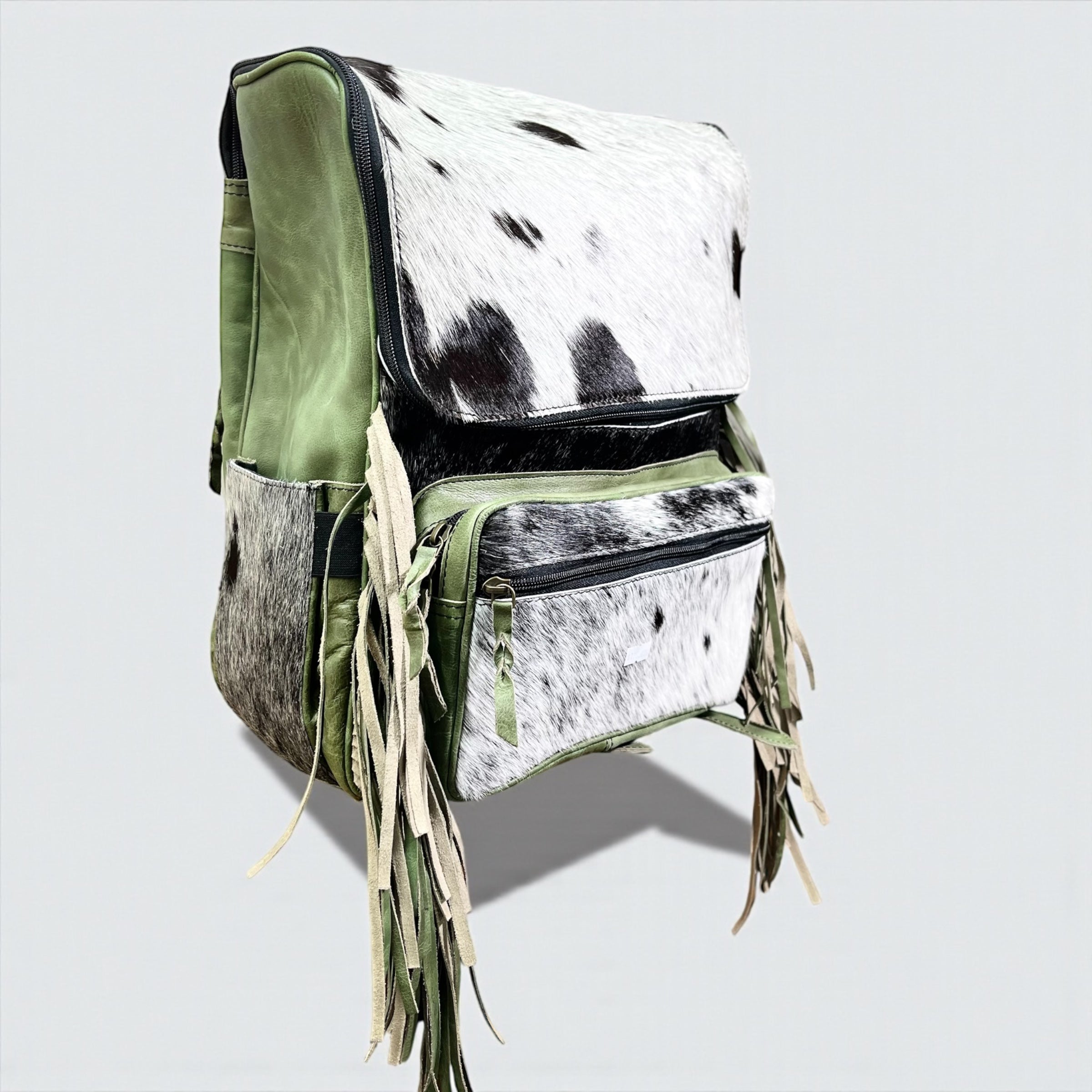 Olive green cowhide & leather fringe backpack